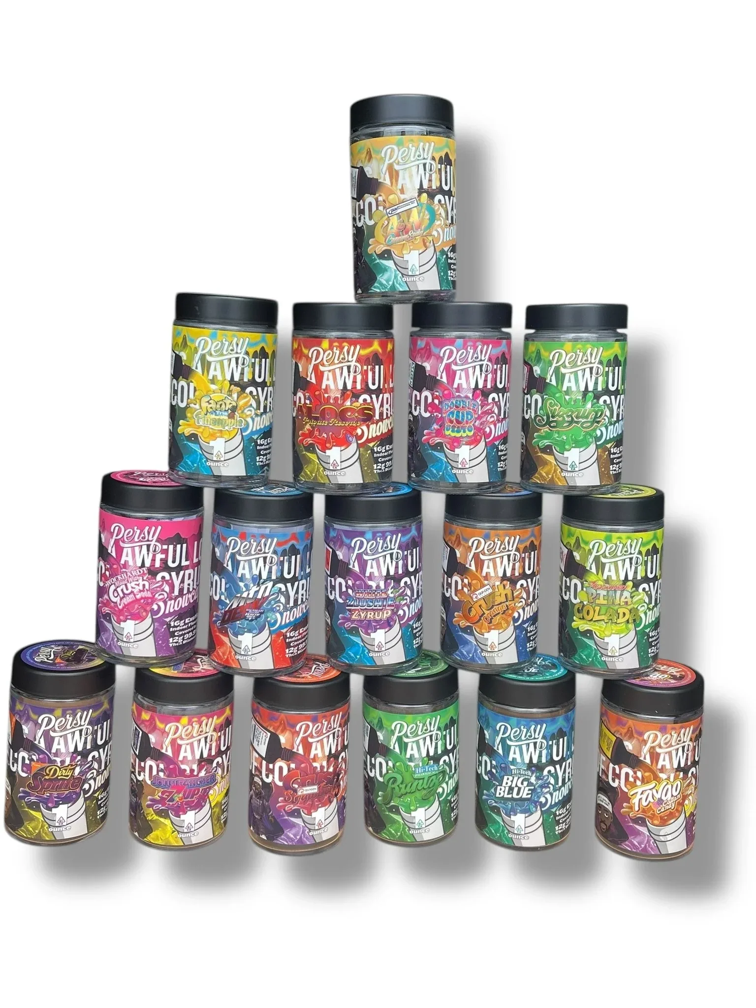 Get ready for one of the most hyped collaborations in cannabis — the Persy x That’s A Awful Lot of Cough Syrup Snowcaps Limited Edition Drop! This exclusive 1-pound box comes loaded with 16 premium 1oz jars of top-shelf indoor flower expertly coated in high-potency THCa diamonds and live resin. Expect that signature thick, frosty diamond-dusted look, loud syrupy terpenes, insane potency (30%+ THC vibes), and effects that hit euphoric, gassy, and long-lasting — a true collector’s item blending streetwear culture with Persy’s legendary quality.